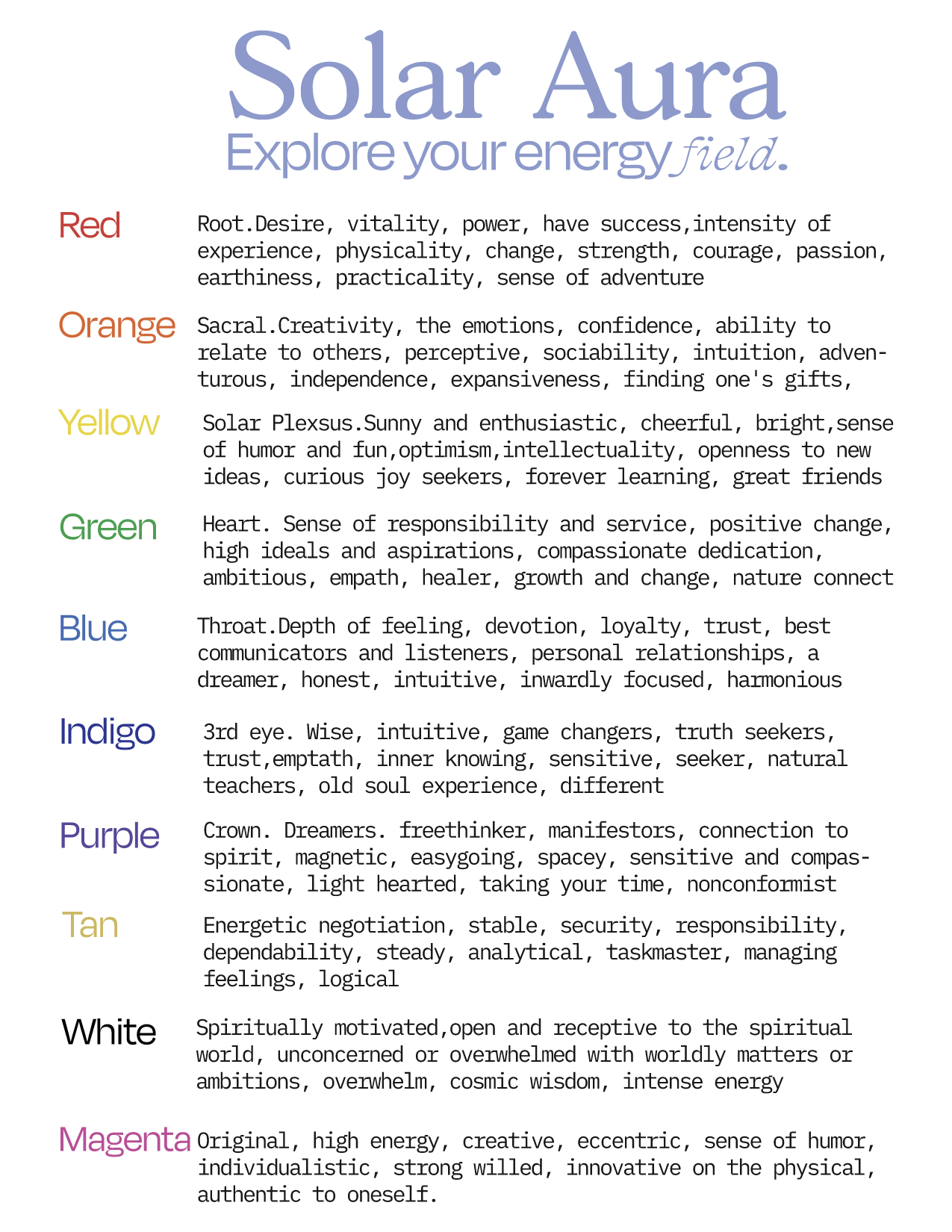 The below will help you interpret your own aura. The color studies and emotional map are based on a compilation from Guy Coggins - the inventor of the Aura Camera, many books on the subject from ancient vedic texts to modern-day interpretations (read my blog post here) and intuitive adjustments based off the setting of my own camera.
